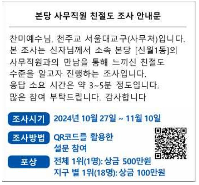 본당 사무직원 친절도 조사 안내문 페이지 정보 작성자 기획ㆍ홍보분과 댓글 0건 조회 1,751회 작성일 24-10-27 23:08 목록 본문 ※ 위 QR코드는 카메라를 이용하시면 URL Link가 생깁니다. 댓글 0 댓글목록 등록된 댓글이 없습니다.