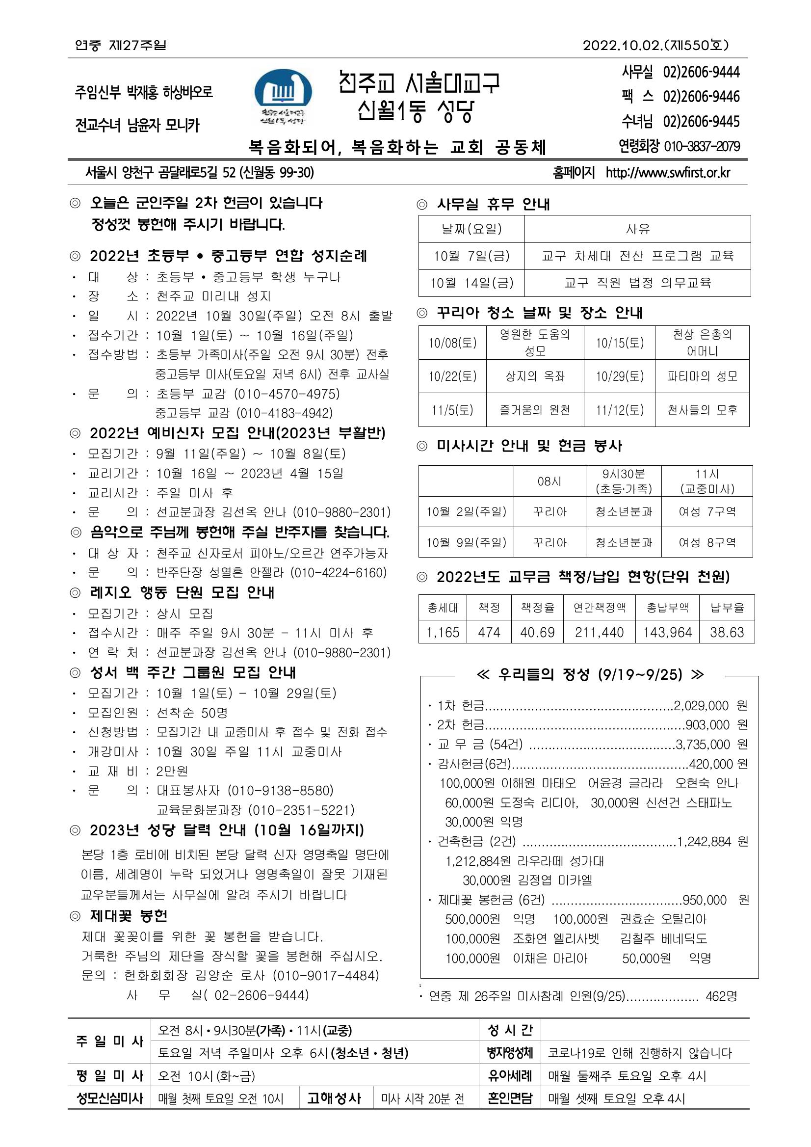 2022년 10월 2일 신월1동 성당 주보 페이지 정보 작성자 관리자 댓글 0건 조회 525회 작성일 22-09-29 11:07 목록 본문 댓글 0 댓글목록 등록된 댓글이 없습니다.