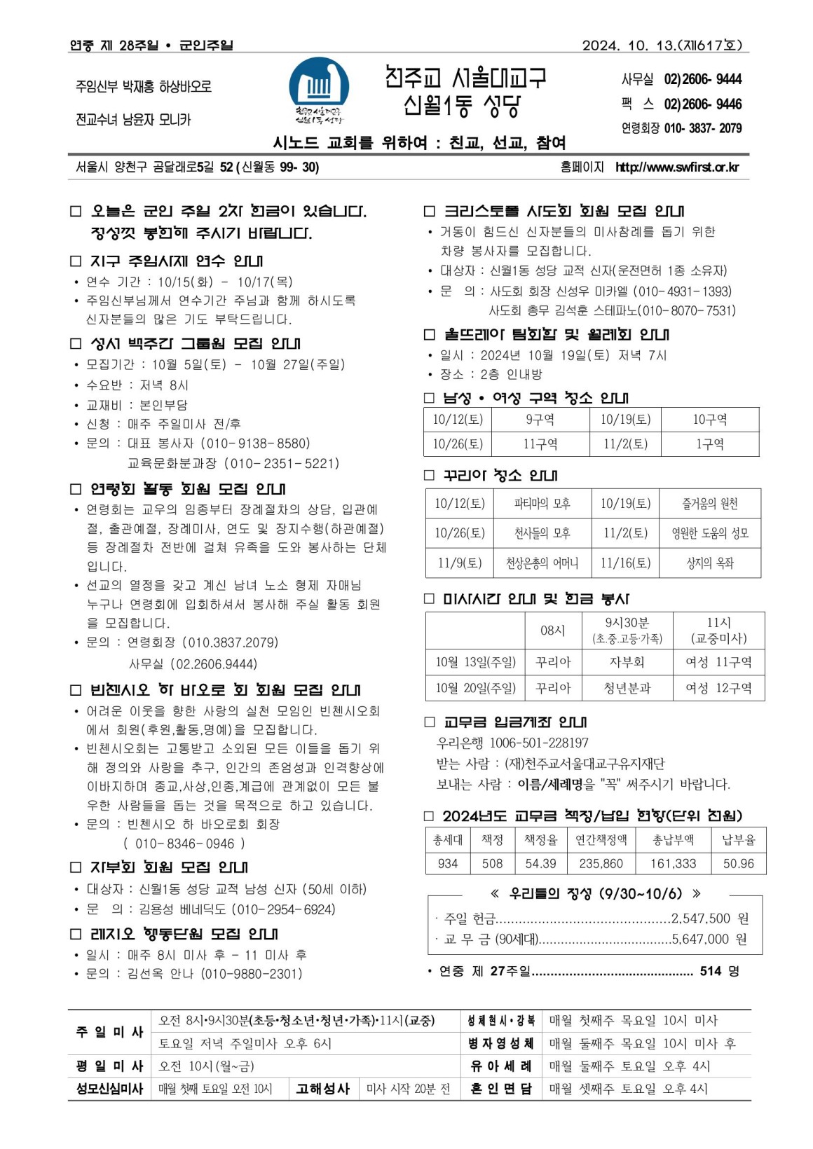 2024년 10월 13일 연중 제28주일 군인주일 페이지 정보 작성자 최고관리자 댓글 0건 조회 170회 작성일 24-10-14 13:05 목록 본문 댓글 0 댓글목록 등록된 댓글이 없습니다.
