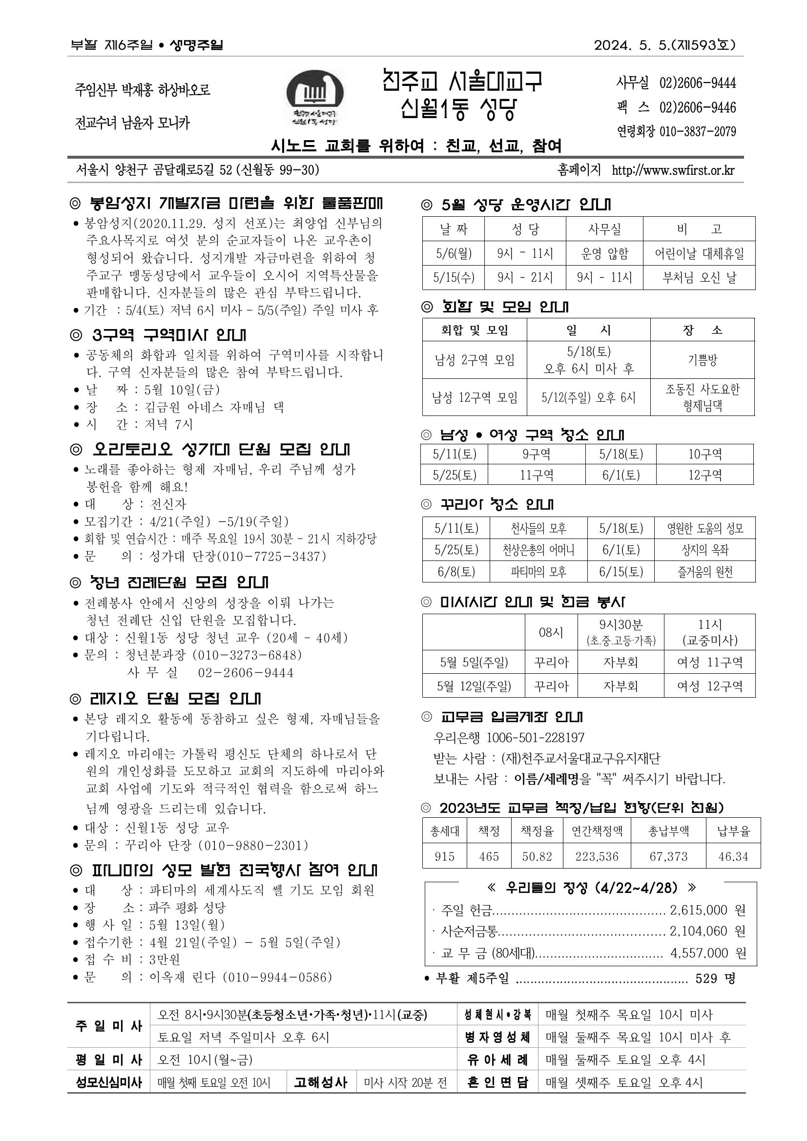 2024년 5월 5일 부활제 6주일(생명주일) 페이지 정보 작성자 관리자 댓글 0건 조회 521회 작성일 24-05-04 11:35 목록 본문 댓글 0 댓글목록 등록된 댓글이 없습니다.
