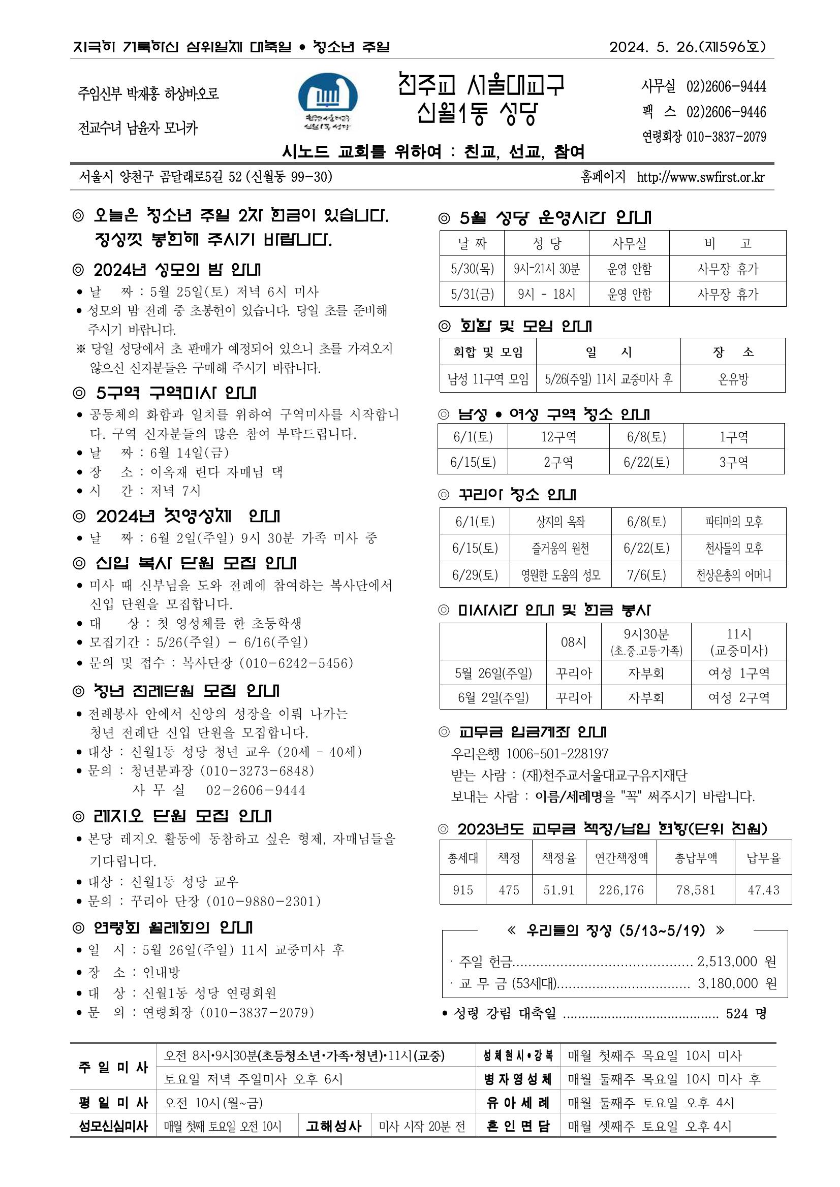2024년 5월 26일 지극히 거룩하신 삼위일체 대축일(청소년주일) 페이지 정보 작성자 관리자 댓글 0건 조회 470회 작성일 24-05-24 21:42 목록 본문 댓글 0 댓글목록 등록된 댓글이 없습니다.