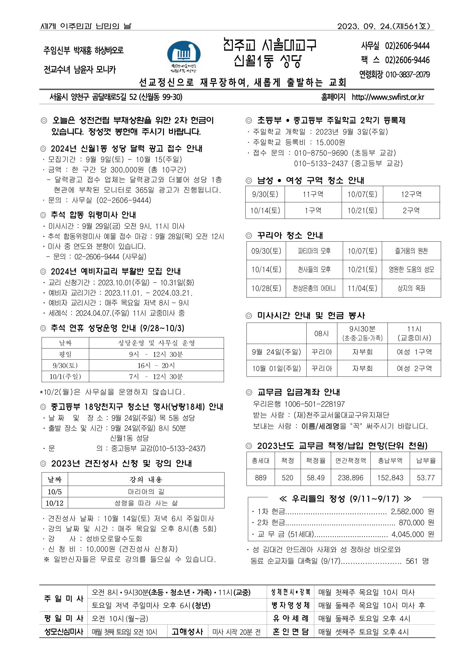 2023년 9월 24일 주보 (연중 제25주일, 세계 이주민과 난민의 날) 페이지 정보 작성자 관리자 댓글 0건 조회 529회 작성일 23-09-22 19:57 목록 본문 댓글 0 댓글목록 등록된 댓글이 없습니다.
